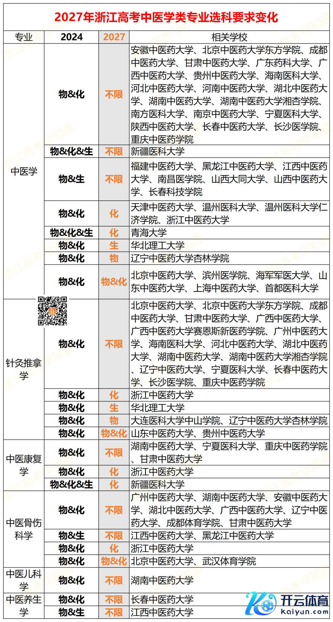 2025年02年20日,浙江省素质教师院官网发布了《2027年及以后粗莽高校招生专科选考科目条目》体育游戏app平台,具体执行有哪些变化呢? 1.2027选考科目条目变化最多的专科是中医学类关连专科,大部分学校选科条目变为不限,包括中医学、针灸按摩学、中医康复学、中医骨伤科学、中医养生学、中医儿科学。这意味着,2027年起,文科生也能报收用医学类关连专科,触及招生蓄意约为1232东说念主(对表2024年招生蓄意),这对文科考生来说是一个大利好。 具体变化见下表: 2.2027选考科目条目变化较