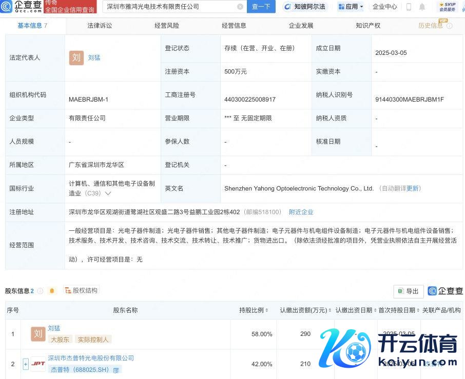 企查查APP披露,近日,深圳市雅鸿光电时代有限牵累公司竖立,法定代表东说念主为刘猛,注册老本500万元,经营界限包含:光电子器件制造;光电子器件销售;其他电子器件制造;电子元器件与机电组件开发制造等。企查查股权穿透披露,该公司由杰普特(688025)等共同抓股。